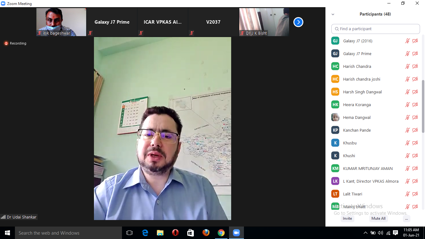 KVK, Bageshwar organized online e -Gosthi on the occasion of world milk day on 01-06- 2021. Dr. Kamal Kumar Pande In charge KVK welcomed all the participants and introduced the programme. Director ICAR-VPKAS, Almora Dr. Lakshmi Kant said in his inauguration lecture that milk is a completed food and dairy farming is an integral component of agriculture. Further many informative topics on Milk production were covered during the e- gosthi. Dr. J.K. Bisht Principal Scientist ICAR-VPKAS, Almora explained about the fodder management in hills, Chief Veterinary Officer, Bageshwar Dr. Uday Shankar provided information about various government schemes to the farmers. Dr. Mayank Maithani from Animal Breeding Farm, Kalsi, Dehradun delivered lecture on breed improvement through artificial insemination techniques. Speakers from KVK, Bageshwar Dr. Nawal Kishor Singh Mr. Medni Pratap Singh and Smt. Nidhi Singh gave elaborative information on animal health, nutrition management, Azolla production for livestock and hygienic milk production. Mr. Harish Chandra Joshi from KVK, Bageshwar delivered concluding lecture. Fifty participants did participation in this e- gosthi .